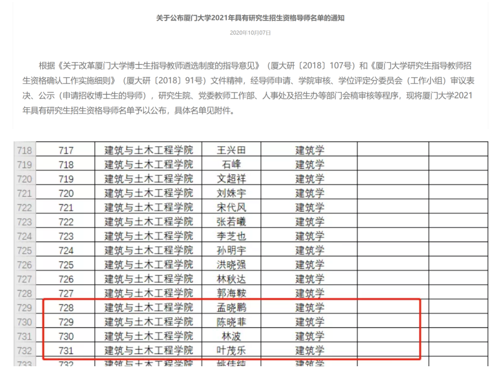 2020年10月,环境设计专业林波教授、孟晓鹏副教授、叶茂乐副教授入选厦门大学2021年建筑学专业硕士生导师