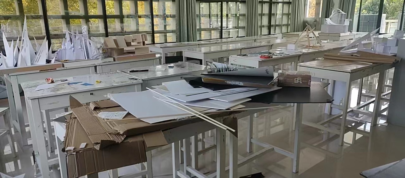 专业教室是我院教学和实践创作的重要场所,平时卫生由物业维护。由于课程的特殊性,我院专业教室经常会有大量画材、纸板以及其他创作材料遗留。为保护学生创作成果,物业不敢随意清理,日积月累,大部分专业教室存在环境脏乱等情况。