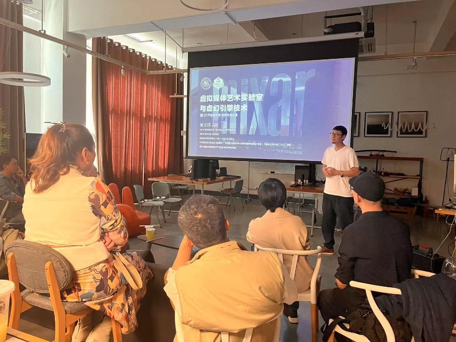 首先,执行院长林波对来访人员表示热烈欢迎,并表示此次参访将有助于加强两校之间的交流,共同推进实验室建设与发展。随后,实验室主任崔文铮老师进行了虚拟媒体艺术实验室与虚幻引擎技术专题分享,详细介绍了实验室目前取得的成绩、教学结构模式、学生团队管理模式,此外,还展示了部分实验室优秀作品。