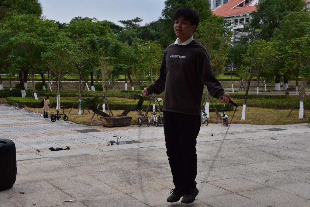 根据比赛规则,计算一分钟跳绳个数,每人最多跳2次,统计成绩高的数据。比赛场地设置在人文楼2楼大厅及户外平台,分4个场地展开比赛,由我院体育部学生干部负责计数。