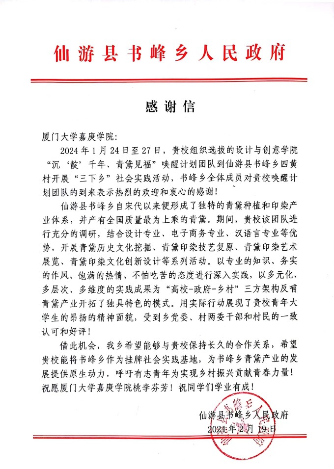 村校合力,推波助“蓝”;赓续前缘,反哺家乡。为了能够抢救性的保护福建仙游青黛濒临灭绝的马蓝种植农业文化遗产和传承青黛印染技艺传统文化,“沉‘靛’千年,青黛见福”唤醒计划团队前往福建省莆田市仙游县书峰乡四黄村,开展为期4天的寒假社会实践活动。在实践过程中,将仙游青黛历史脉络和生存状态为研究重点,团队通过文献查阅、实地走访、创新设计、艺术展览等形式,以历史文化挖掘、工艺复原和创新设计为手段,以复兴福建青黛产业文化为愿景,进而达到以青黛文化创意产业赋能乡村振兴的目的。在此基础上挖掘一项千年青黛历史、复活一项传统工艺、塑造一个文化创意品牌、创立一项文化创意产业,通过对仙游青黛文化的深度挖掘和传承创新,对面临发展瓶颈的青黛产业注入文化活力,增强青黛产业的对外的宣传张力,充实了福建海上丝绸之路的印染文化。