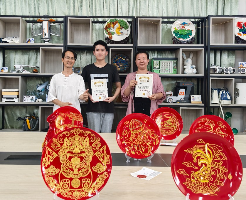 活动伊始,学生们深入观摩大师的精湛技艺,系统学习漆线雕的历史渊源、工艺流程与核心美学价值。随后,在导师们的启发下,学子们将目光投向中西文化的交融点,尝试将传统漆线雕技艺与现代设计语言、西方美学元素进行创新性结合。在紧张的12天创作与制作周期内,同学们热情投入,反复推敲设计稿,一丝不苟地完成搓线、盘绕、堆叠、贴金等复杂工序,将仓构想转化为一件件独具匠心的实体作品。