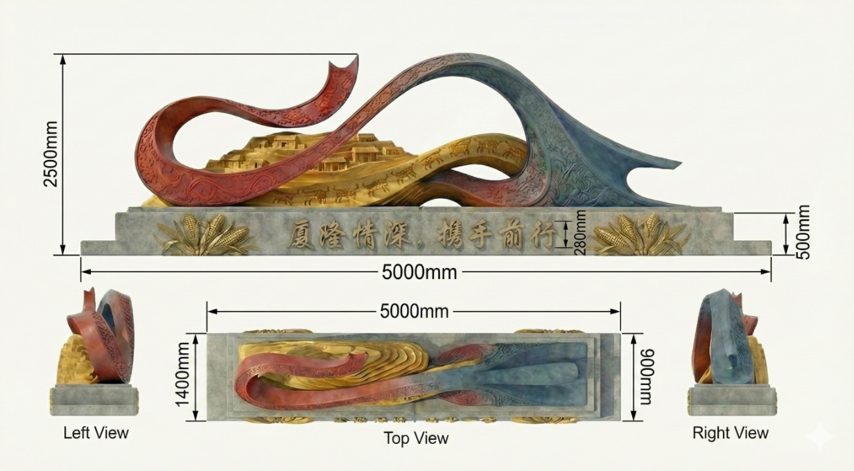 在导视牌设计的讨论中,团队最初聚焦于如何体现村庄标识的辨识度为主要目标。有成员提出,隆德舞狮作为当地节庆民俗的典型符号,蕴含着驱邪纳福的美好寓意,何不将其融入设计?经过多轮碰撞,最终确定以舞狮的灵动姿态为基础造型,结合木质/石材的自然质感,既展现乡土气息,又赋予导视系统独特的文化温度。方案汇报时,驻村书记提出需兼顾夜间可视性和耐久性,团队随即调整为金属烤漆/亚克力材质与发光工艺,最终定稿方案在保留舞狮文化韵味的同时,实现了功能性与艺术性的统一。